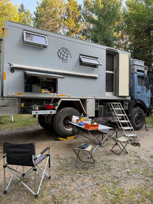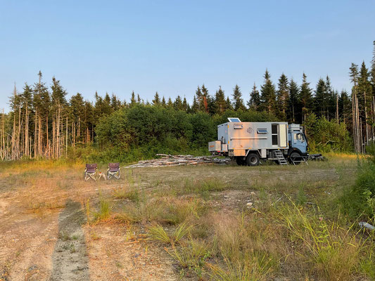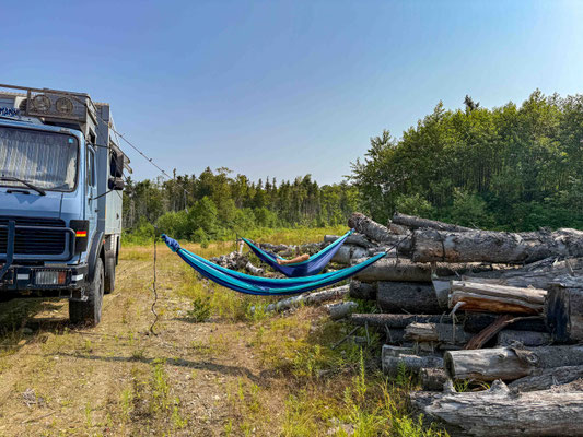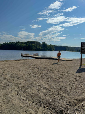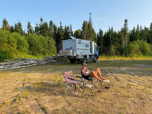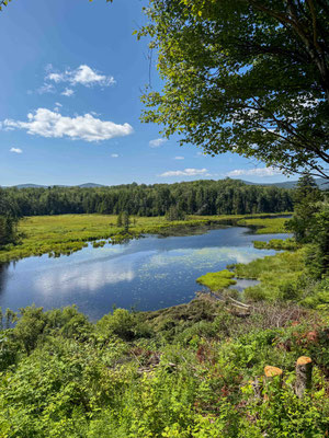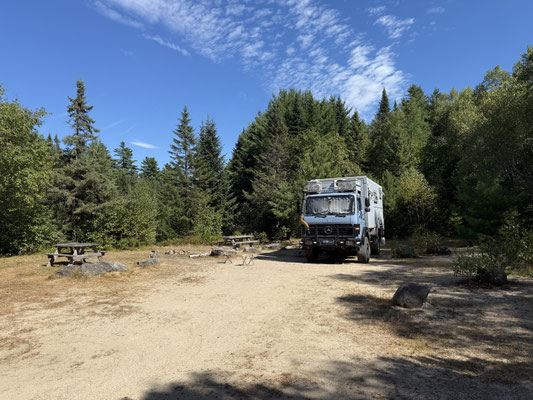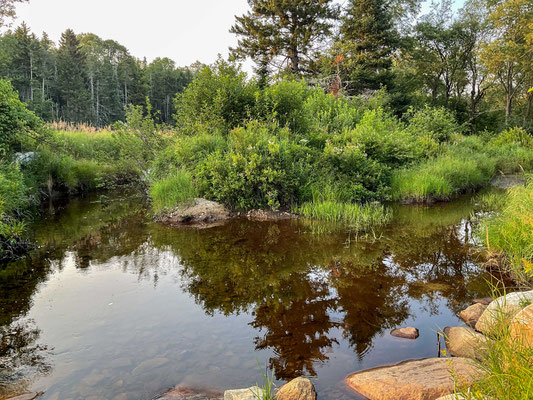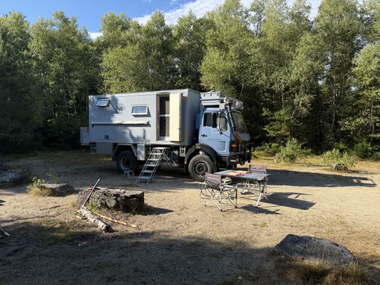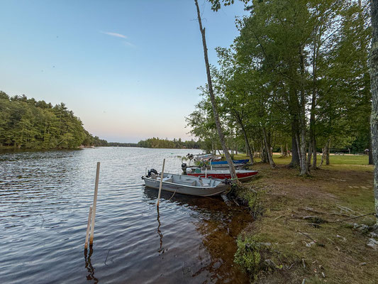 From there, we continue a little further towards the mountains. We had spotted a few free parking spaces there, but the locals seemed to know about them too. We only realized this after we had fought our way a few kilometers along forest roads and through dense woodland. In the end, we ended up back at a campground, at least in a pine forest and with a nice beach by the lake. We would have liked to stay there a little longer, but it's the weekend again and our spot is reserved. So we move to Peaks Kenny State Park on Sebec Lake. There, Karin suddenly develops a high fever and is knocked out for a few days. The place isn't great for staying longer, so we drive on to a very nice free parking spot by a river where Karin can recover from her flu.