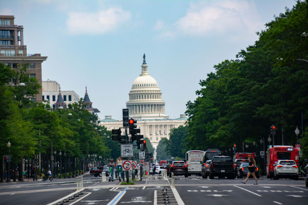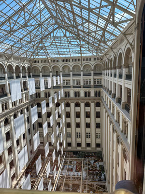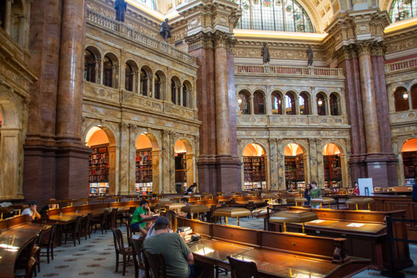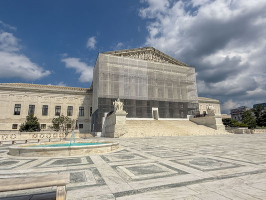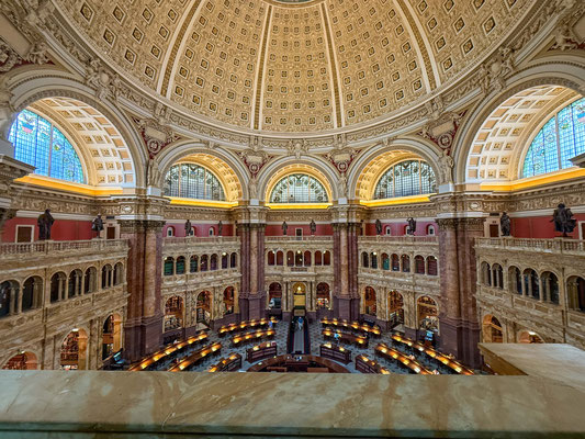 At 9 a.m., we set off again for Union Station, the city's central transportation hub. When you leave the station, you are immediately in the middle of the action with a view of the Capitol and the National Mall. On the forecourt, a few tireless protesters are demonstrating against the current government with placards and collecting signatures. From there, we continue to the Capitol, which we first photograph extensively from the outside and then take a guided tour. A film introduces us to American history, followed by a tour of the various halls with many historical paintings and numerous statues of important figures. For the House of Representatives gallery, we had to get a separate free ticket. It's an uplifting feeling to look down from the gallery at the Speaker's podium and the place where the president recently gave his speech to the nation after his first hundred days in office. Everything looks exactly like it does on TV, but unfortunately, photography is prohibited. A connecting passageway leads to the National Library, which houses the Gutenberg Bible and many other priceless books. A few hundred meters further on is the Supreme Court, whose facade is unfortunately currently being renovated, so we only saw it from the outside.