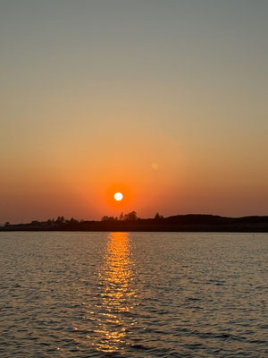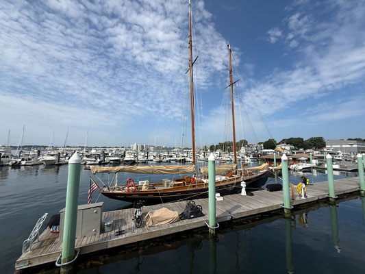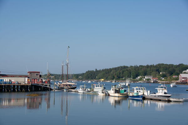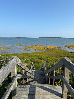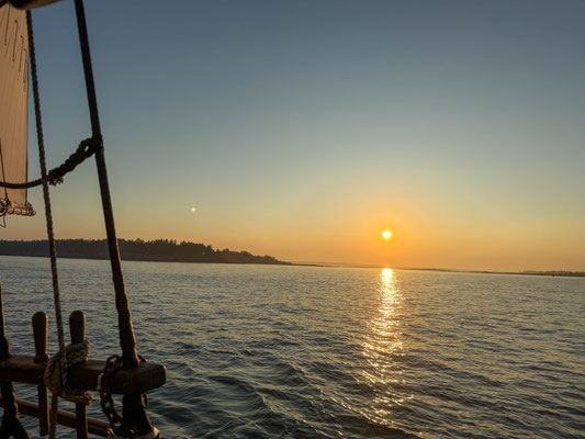 In Freeport, we go shopping for clothes for the grandchildren at the outlet center and then drive to Bailey Island to a Harvest Host that has a beautiful parking space with a view of the sea. Bailey Island is located in Casco Bay and is less than a mile wide, with a predominantly rocky coastline, several bays, and about 400 people living there. Since 1928, the Cribstone Bridge (also known as Cobwork Bridge) has connected Bailey Island with Orr's Island. It is unique: built of granite stones in an open grid structure that allows the strong tides to flow through, it is considered the only example of this type of construction in the world. For the evening, we booked a sunset cruise on a 70-foot two-masted schooner and sailed out into the bay for a good two hours to watch the sunset.