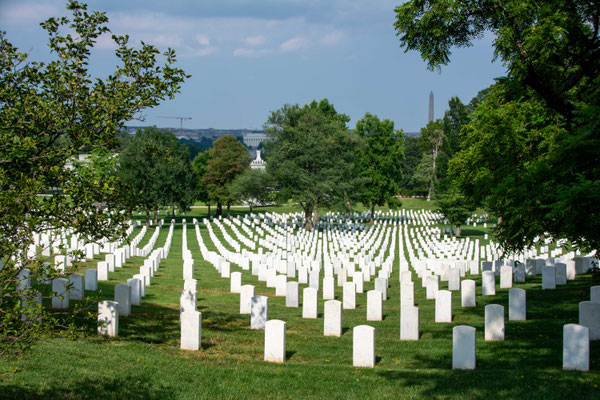 At around 4 a.m., we drove to Arlington Cemetery, which was founded during the Civil War in 1864. The site serves as a burial place for soldiers and civilian relatives. There are more than 400,000 graves and memorials on over 640 hectares. Among them are those of John F. Kennedy and his wife Jacqueline, as well as other members of the family. As a central memorial for unknown soldiers from various wars, a resting place was established in 1921 after World War I for soldiers who were unknown or whose identities could not be determined. A white marble cube/memorial stone with a flat rotating tower above it lies within a framing ring of trenches and is guarded by guards in dark blue uniforms. The changing of the guard by the Ceremonial Guard takes place at fixed intervals. Unfortunately, the gates close at 5 p.m., so we had to rush through the cemetery. But that's enough for today, and we drive back to the campground.