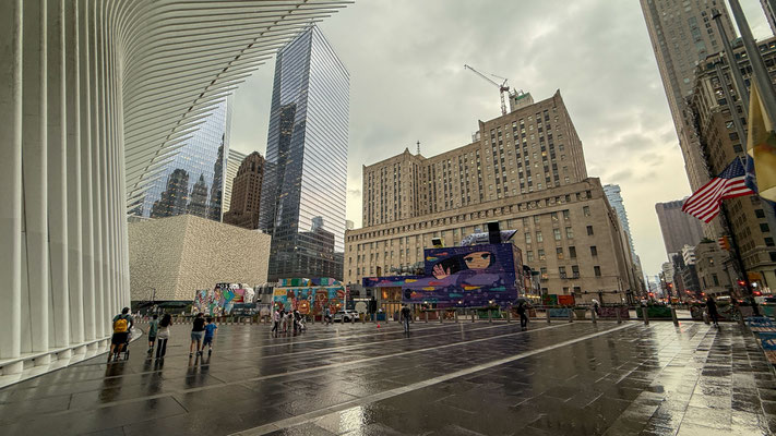 On the way back, we look anxiously at the skyline. Very dark clouds are already gathering in the sky. The heatwave of the last few days collapses and unleashes a storm that causes flooding and severe weather warnings around New York. We take refuge in the World Trade Center and wait to see what happens. Anneliese is unable to pick us up at the ferry terminal as planned because many roads are closed. During a brief break in the rain, we manage to make it to the bus station. From there, we travel to New Jersey, where Anneliese can pick us up.