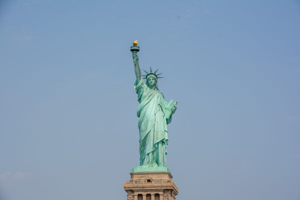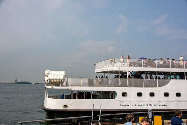 We visited New York for a few days back in 2009. Back then, however, it was March, with temperatures of 5 degrees and an icy wind. We almost froze to death waiting in line for the ferry to Liberty Island and gave up after an hour. So we still have that to do, and we plan a day trip to the city. Anneliese kindly drives us to the ferry terminal. From there, we cross over to Manhattan and continue by bus to Battery Park, the ferry terminal to Liberty and Ellis Islands. Today, with temperatures around 35 degrees, we certainly won't freeze to death, and we cross over to Liberty Island without a long wait. We can see the impressive Statue of Liberty from afar and walk around the island to take photos from every angle. The weather is on our side and even gives us a few minutes of smog-free blue sky.
