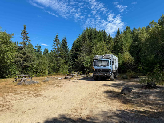 After five wonderful weeks in Newfoundland, we cross the Gulf of St. Lawrence at the end of May. From St. Barbe, it is only a short crossing of one and a half hours to Blanc Sablon, in the far north of Quebec. We have to take advantage of the French flair and get some fresh croissants in a café. That's it for Quebec because just a few kilometers further on we are already in Labrador and find a dream spot on a lake where we stay for two days. The Trans Labrador Highway now lies ahead of us with a few small towns and otherwise a lot of nothing and endless forests. The highway ends after 1700 km at the St. Lawrence River in the province of Quebec. The most important thing is to have a full tank, as the next filling station can be more than 500 km away. There is only sporadic cell phone reception along the entire route and we use the police service and borrow a satellite phone from the Northern Light Hotel. It costs nothing and connects you directly to the Royal Canadian Mountain Police in an emergency.